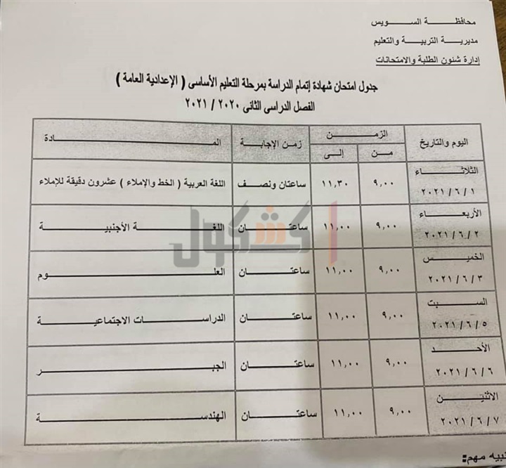 ننشر جدول امتحانات الشهادة الإعدادية في محافظة السويس.. مستند
