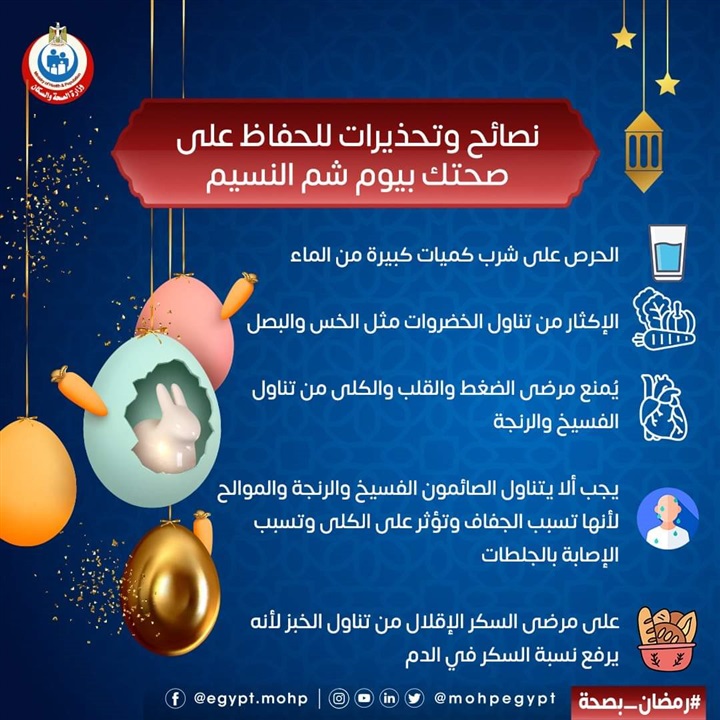 تزامنا مع يوم شم النسيم الموافق 3 مايو2021، قدمت وزارة الصحة والسكان نصائح وتحذيرات للحفاظ على صحتك في هذا اليوم.