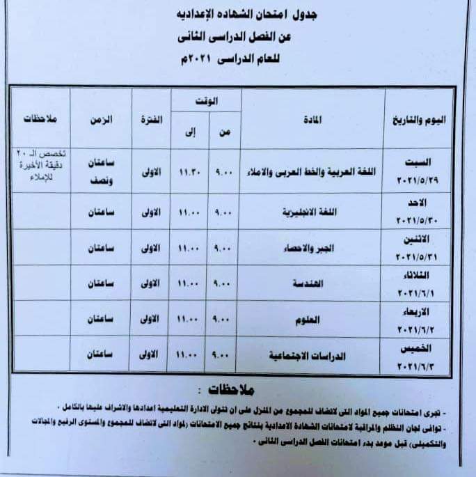 أعلن محمد حامد عقل وكيل وزارة التربية والتعليم بجنوب سيناء اليوم الأربعاء 5 مايو 2021، أن اللواء خالد فودة محافظ جنوب سيناء قد اعتمد جدول امتحان الشهادة الإعدادية للفصل الدراسي الثاني للعام 2021 بمحافظة جنوب سيناء .