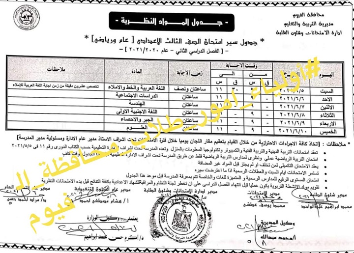 أعلنت مديرية التربية والتعليم بمحافظة الفيوم، عن جدول سير امتحانات الفصل الدراسي الثاني 2020-2021 للصف الثالث الإعدادي "عام ورياضي".