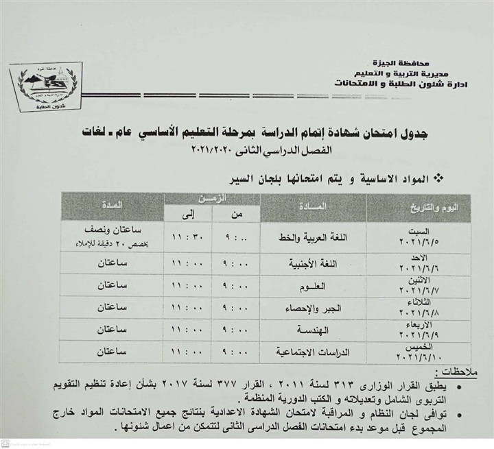 اعتمد اللواء أحمد راشد محافظ الجيزة، ومجدى الجيار وكيل مديرية التربية والتعليم بالجيزة، جدول امتحان شهادة إتمام الصف الثالث الإعدادى "عام ولغات" للفصل الدراسى الثانى للعام الدراسى 2020/.2021
