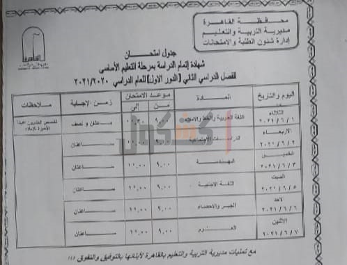 اعتمد اللواء خالد عبد العال، محافظ القاهرة جدول امتحان شهادة إتمام الدراسة بمرحلة التعليم الأساسى (الصف الثالث الاعدادى) للفصل الدراسى الثانى للعام الدراسى 2020/2021، وتجرى الامتحانات خلال الفترة من 1 يونيو إلى 7 يونيو 2021.