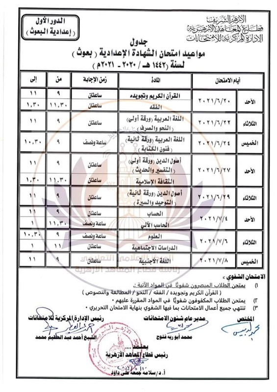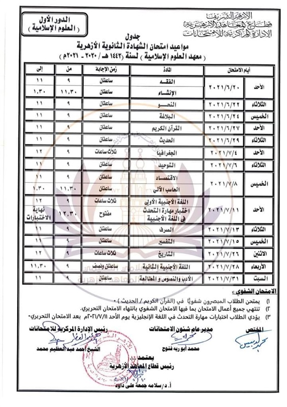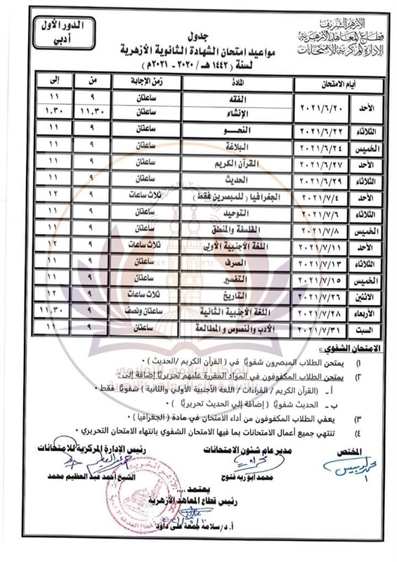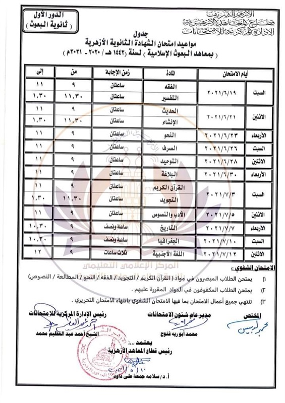 وننشر الخريطة الزمنية لامتحانات الدور الأول والثاني للشهادة الثانوية الأزهرية والقراءات والعلوم والإسلامية وإعدادية وثانوية البعوث، وهي كما يلي: