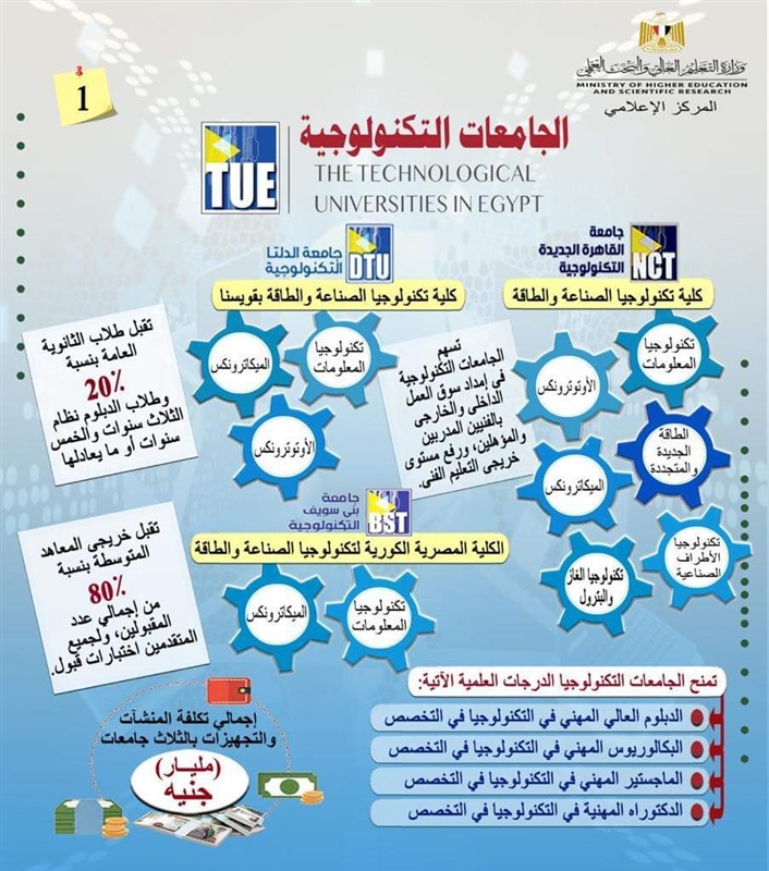 انفوجراف.. مليار جنيه تكلفة المنشآت والتجهيزات بـ3 جامعات تكنولوجية جديدة