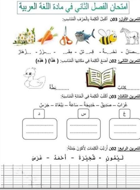 نماذج اختبارات السنة الأولى ابتدائي 2021 - 2022