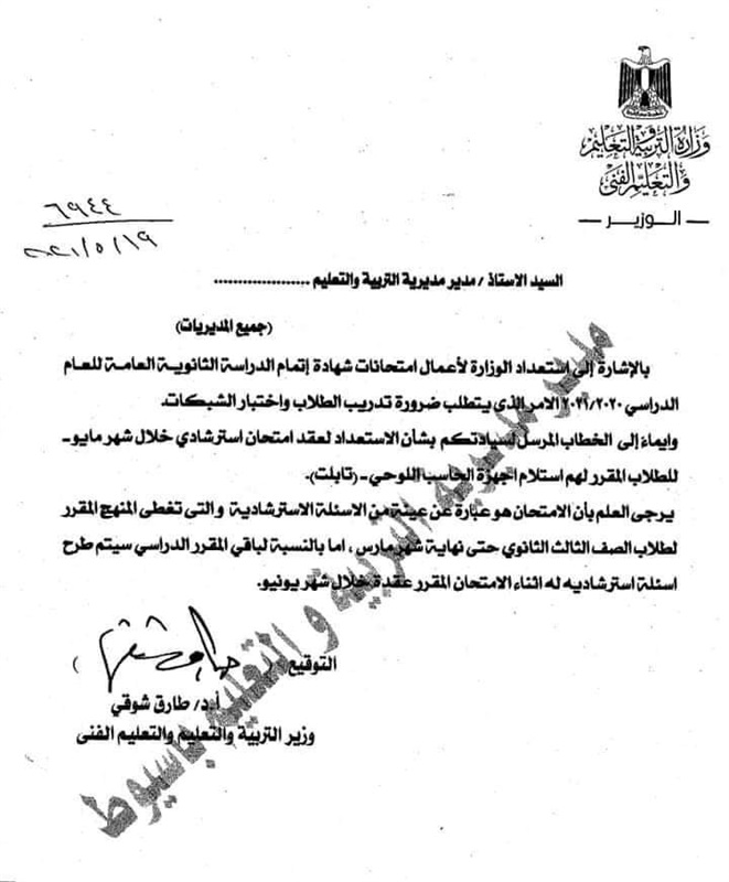 وأرسلت وزارة التربية والتعليم والتعليم الفني، خطابا لجميع مديري مديريات التربية والتعليم بالمحافظات بشأن اجراء امتحان التجريبي للثانوية العامة المقرر عقده في ٢٣ مايو الجاري.