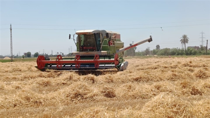 القمح تم باستخدام الميكنة الزراعية (كلاس) والتي تقوم بفصل القمح عن التبن (القش)