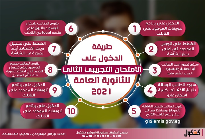 جراف طريقة الدخول على الامتحان التجريبي الثاني للثانوية العامة 2021 "انفوجراف" نورهان عبدالرحمن السبت 22/مايو/2021 - 02:51 م 5/22/2021 2:51:00 PM طباعة ننشر طريقة الدخول على الامتحان التجريبي الثاني للثانوية العامة 2021 facebook twitter whats شارك