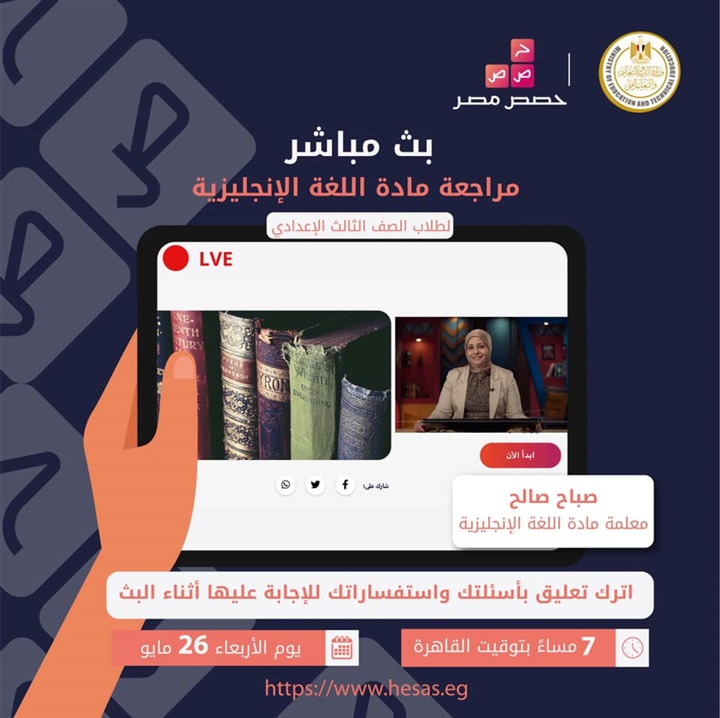 البث المباشر لمراجعة مادة اللغة الإنجليزية، وقالت الوزارة أن موعد البث سيكون