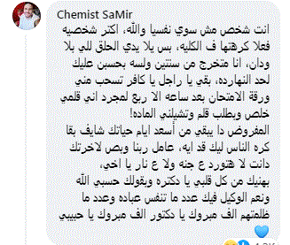وعلق الطالب أحمد محمود: "مش هزايد عليك أكتر من الكلام اللي اتقال، لأنك حرفيا أذتنا نفسيا في كل تعامل معاك، وكرهتنا في حياتنا كلها من كلمه ملهاش لازمه طلعت منك ف سيكشن مش فاكرين منه حاجه غير أذيتك، حسبنا الله ونعم الوكيل فيك ياخي، عليك من الله ما تستحق والله، لا أكثر فـ نظلمك ولا أقل فـ لا تشف صدورنا".