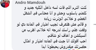 بينما قال الطالب أندرو ممدوح: "كنت الترم اللي فات لسه داخل الكلية جديد وكلمني بأسلوب وحش وأنا محتاس في الشغل العملي وخلاني اتوترت زيادة، وقالي مش هتعرف تجيب امتياز في الماده دي لو وقفت على راسك، لدرجة أنه خلاني اهرب من السيكشن وأخاف لو شافني، أحب اقولك أنا جبت في الماده امتياز وأمثال حضرتك ميقدروش يحبطونا أبدا".