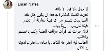 قالت الدكتورة إيمان نافع، مدرس علم النفس التربوى بكلية التربية جامعة الزقازيق: «نعزى أنفسنا كدكاترة جامعة أن يكون مثل هذه السلوكيات تصدر من أى هيئة معاونة أو عضو هيئة تدريس.. ربنا يهدي، فعلا حزنت لما قرأت مواقف الطلبة وكسرة نفسهم وإهانتهم، الطالب ليه احترامه الكامل يا سادة.. احترام آدميته على الأقل".