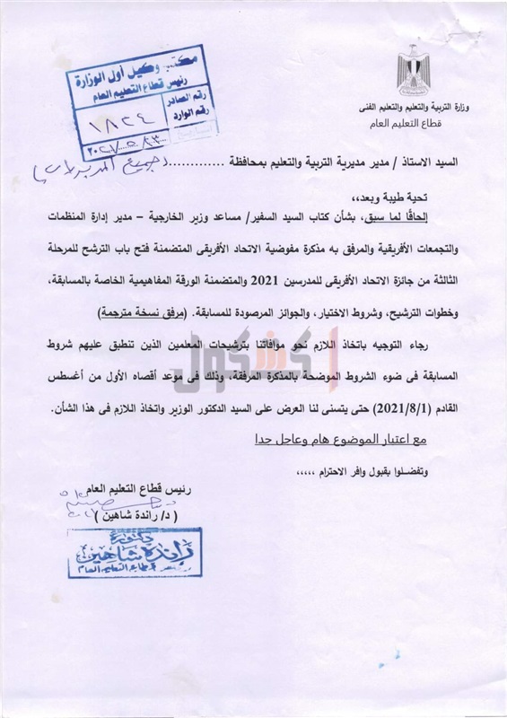 أعلنت وزارة التربية والتعليم والتعليم الفني عن فتح باب الترشح للمرحلة الثالثة من جائزة الاتحاد الإفريقي للمدرسين 2021 وذلك عبر الرابط التالي :