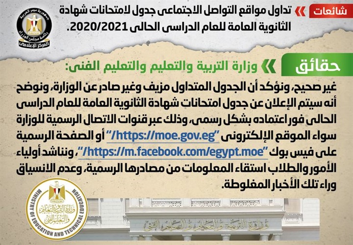 الحالي 2020/2021، وأن الجدول المتداول مزيف وغير صادر عن الوزارة، مُوضحةً أنه سيتم الإعلان عن جدول امتحانات شهادة الثانوية