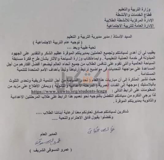 أرسلت الإدارة المركزية للأنشطة الطلابية التابعه لوزارة التربية والتعليم والتعليم الفني، خطابًا لجميع مديريات التربية و التعليم بمختلف المحافظات بشأن اجراء مسابقة السياحة العالمية بين الطلاب.