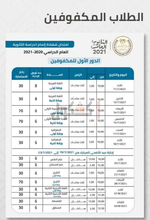 كما أعلن الوزير عن جدول الامتحانات الخاصة بالطلاب المكفوفين والتي من المقرر أن تكون في الفترة من الأحد 11/7/2021 وتستمر حتى الثلاثاء 3/8/2021.