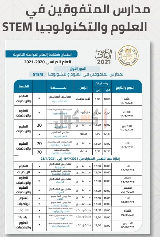 كما أعلن شوقي عن جدول الامتحان الخاص بمدارس المتفوقين في العلوم والتكنولوجيا STEM، والتي من المقرر أن تكون في الفترة من الأحد 11/7/2021 وتستمر حتى الخميس 5/8/2021.