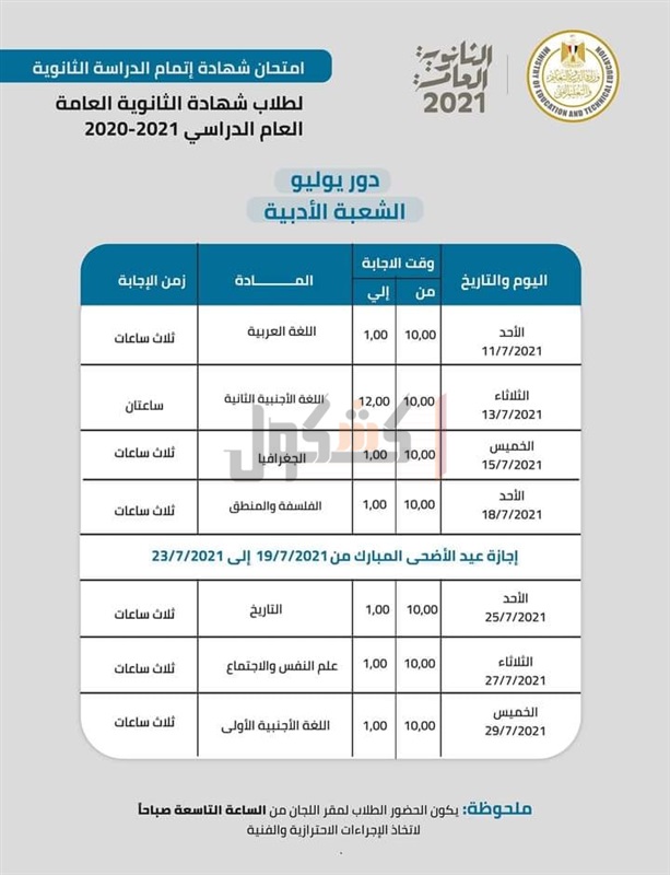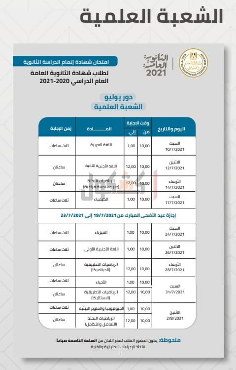 أعلن وزير التربية والتعليم والتعليم الفني عن جدول امتحانات الثانوية العامة للعام الدراسي 2020/2021 (دور يوليو) للشعبتين الأدبية والعلمية، والتي من المقرر أن تكون الامتحانات بداية من السبت الموافق 10/7/2021، وتستمر حتى الإثنين 2/8/2021.