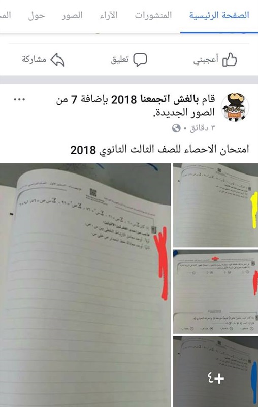 نشرت صفحة "بالغش اتجمعنا 2018" امتحان الإحصاء للثانوية العامة بعد 5 دقائق من بدء اللجنة.
