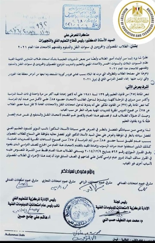 "تنص المادة ٢٥ من قانون التعليم رقم ۱۳۹ لسنة ١٩٨١ علي أنه لايجوز إعادة القيد أكثر من مرة واحدة في ذات السنة الدراسية، وأكثر من مرتين في المرحلة كلها، ويشترط لدخول الطالب الامتحان حضوره ٨٥٪ علي الأقل من عدد أيام الدراسة ،كما تنص المادة رقم ۳۷من القانون المذكور علي أنه يشترط لدخول امتحانات النقل والامتحانات العامة الا تقل نسبة حضور الطلاب عن ٧٥٪ من مجموع الدروس المقررة للتدريبات المهنية بصرف النظر عن سبب الغياب، وحيث أن هؤلاء الطلاب قد تم فصلهم هذا العام، ولايجوز لهم التقدم لامتحان النقل والدبلوم في نفس عام الفصل طبقا لما ورد بقانون التعليم، لذا يرجي التفضل بالنظر في العرض على الدكتور نائب الوزير لشئون التعليم الفني لتفضل سيادته بالنظر في الموافقة والعرض على الدكتور الوزير لتفضله بالموافقة على السماح للطلاب المفصولين، بسبب عدم تحقيق نسبة حضور ٨٥٪ من أيام الدراسة أو ٧٥٪ من مجموع الساعات المقررة للتدريبات العملية، كذلك الذين استنفذوا عدد مرات الرسوب وإعادة القيد بالتقدم لامتحان هذا العام من الخارج للصف الدراسي الذی بلغوه وفق القرار الوزاري رقم ٥٦٢ بتاريخ ٢٠١٤/۱۲/۹، ويستثني الطلاب هذا العام فقط من الشرط المنصوص عليه في القرار سالف البيان بمرور عام دراسي كامل على نجاحهم في الصف السابق دون أن بمتد هذا الإجراء إلى الطلاب المفصولين لأسباب أخرى غير الغياب، والأمر مفوض لكم».