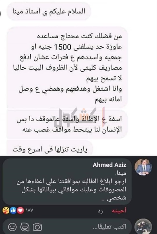 جاء ذلك ردًا على رسالة طالبة، بأنها تحتاج سلفة 1500 جنيه أو مشاركة في جمعية تدفعها على فترات لسداد مصروفاتها الدراسية بالكلية لأن الظروف المالية بمنزلها لا تسمح، متوعدة أنها مستعدة للإمضاء على وصل أمانة لحين السداد.
