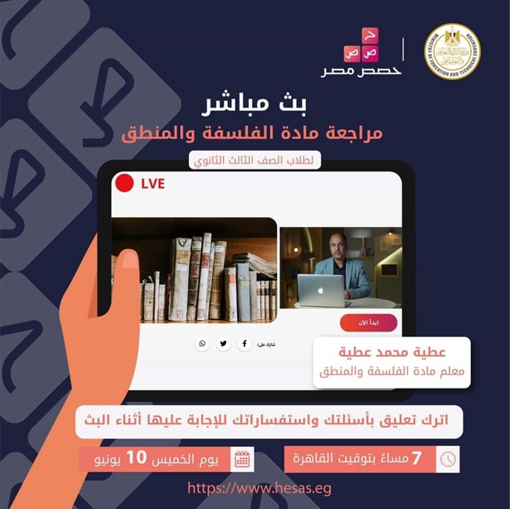 نبهت وزارة التربية والتعليم والتعليم الفني، على جميع طلاب الصف الثالث الثانوي، بمتابعة البث المباشر لمراجعة مادة الفلسفة والمنطق.