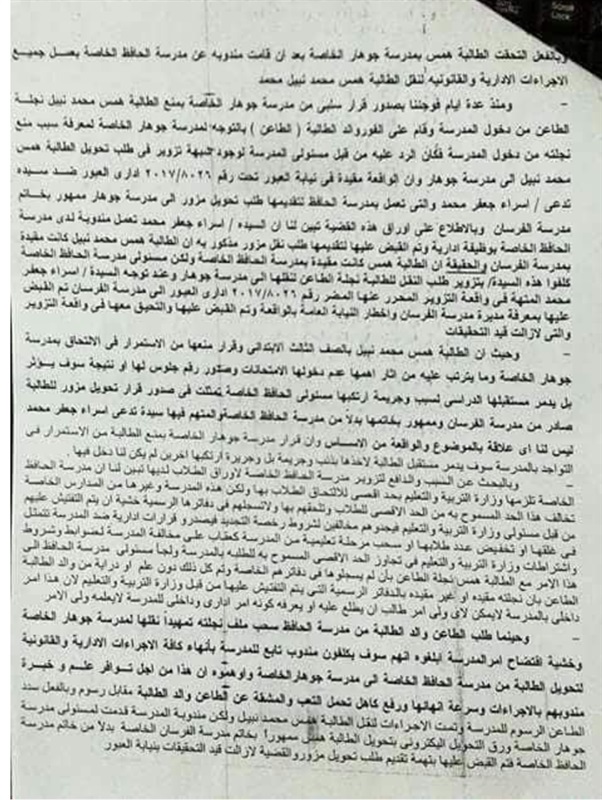مسئولي مدرسة الحافظ لأوراق تحويلها وعدم تسجيلها في أوراقهم الرسمية، مناشدا وزير