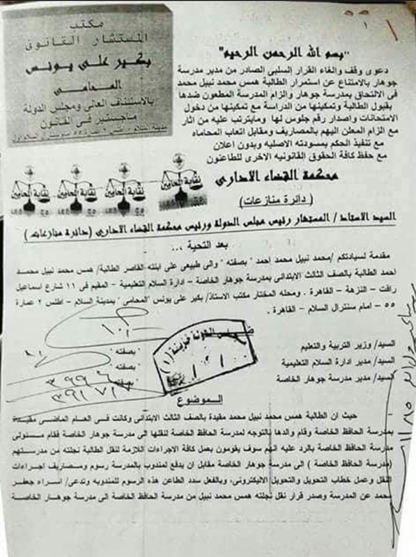إلي أنه عقب ذلك فؤجيء بصدور قرار من مدرسة جوهار الخاصة بمنع ابنته من دخول المدرسة