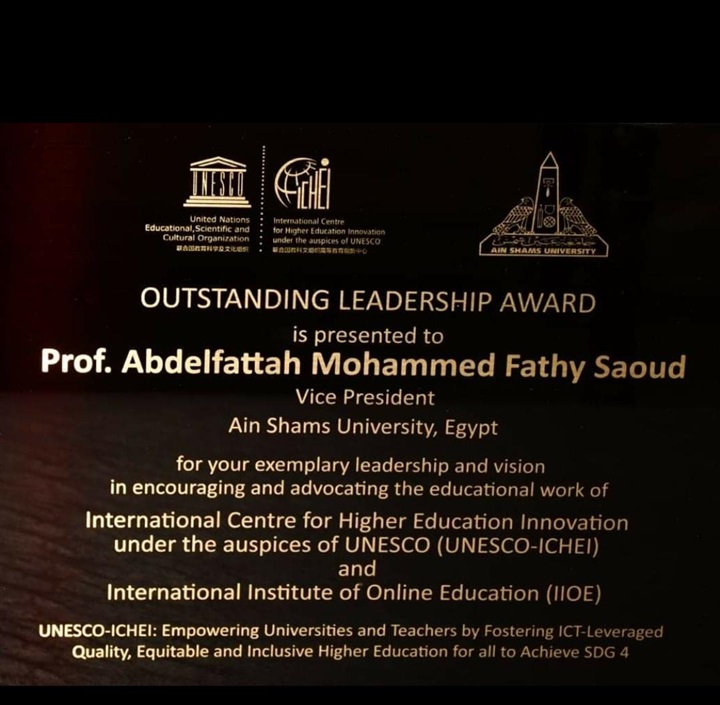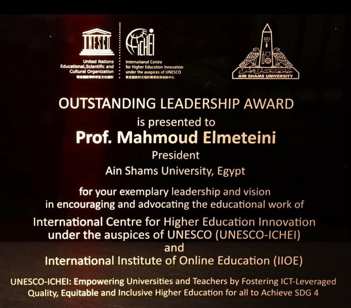 منح المركز الدولي للابتكار في التعليم العالي برعاية منظمة اليونسكو UNESCO -ICHEI بدولة الصين، جائزة القيادة الفائقة للدكتور محمود المتيني رئيس جامعة عين شمس، كما منح جائزة القيادة الفائقة للدكتور عبدالفتاح سعود نائب رئيس جامعة عين شمس لشئون التعليم و الطلاب.