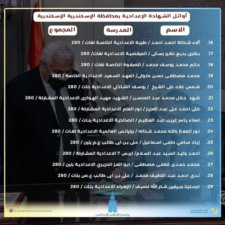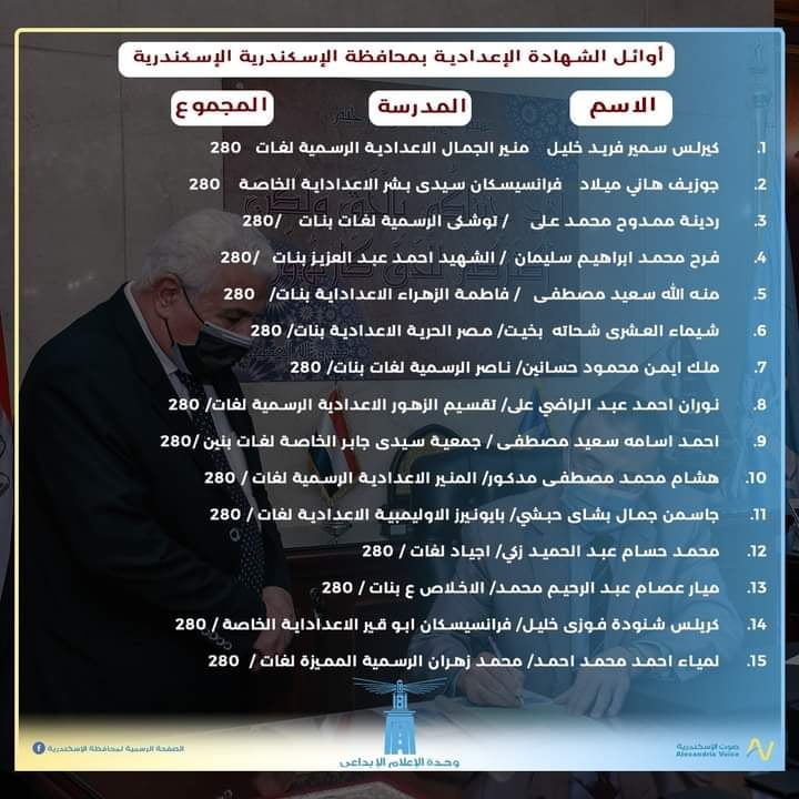 أسماء أوائل الشهادة الإعدادية 2020- 2021 بالإسكندرية