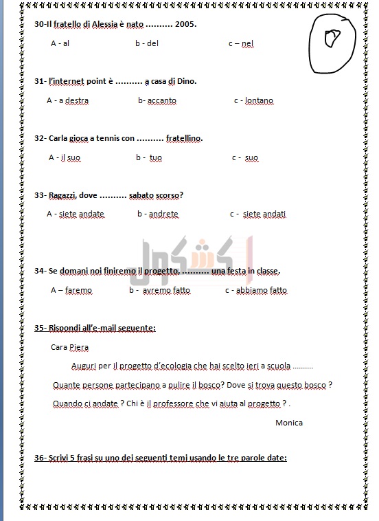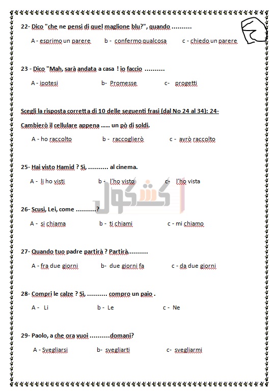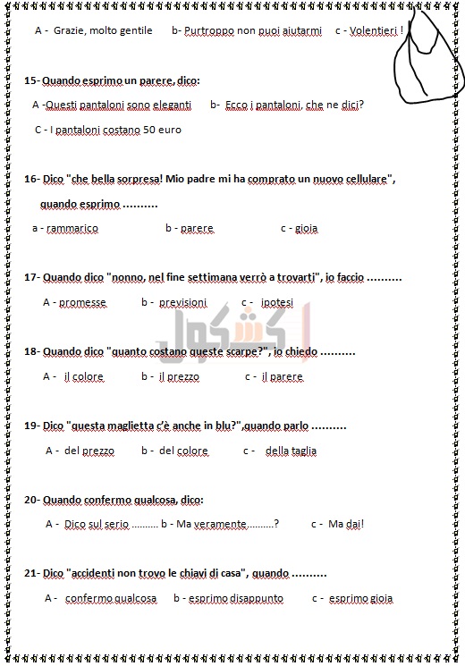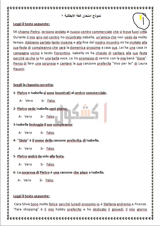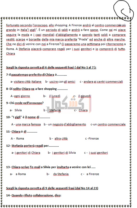 مدارس نموذج تدريبى لامتحان اللغة الإيطالية للثانوية العامة (1) نورهان عبد الرحمن الثلاثاء 05/يونيو/2018 - 10:04 م 6/5/2018 10:04:00 PM طباعة يقدم موقع "كشكول" نموذج أول تدريبى لامتحان مادة اللغة الإيطالية للثانوية العامةإعداد الأستاذ مخلص رجبمعلم خبير لغة إيطالية facebook twitter whats شارك