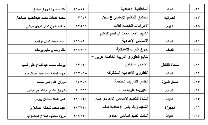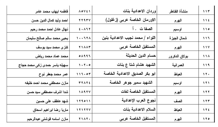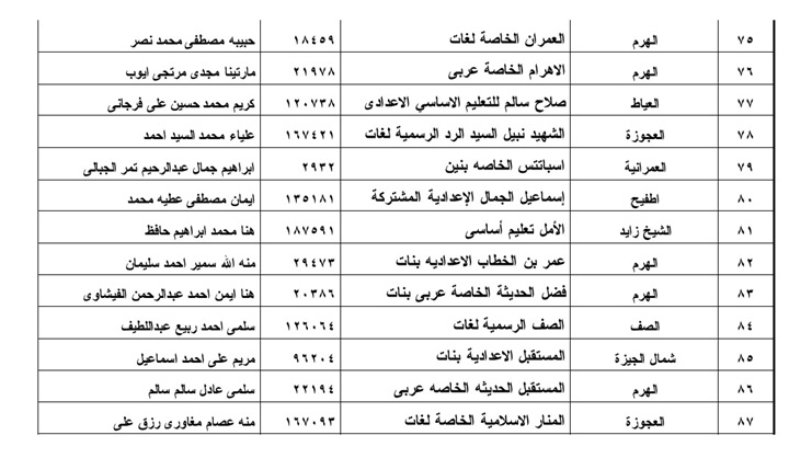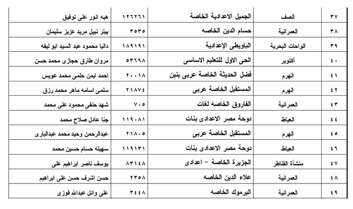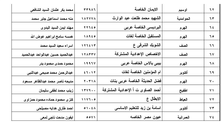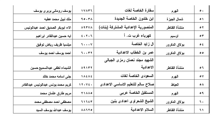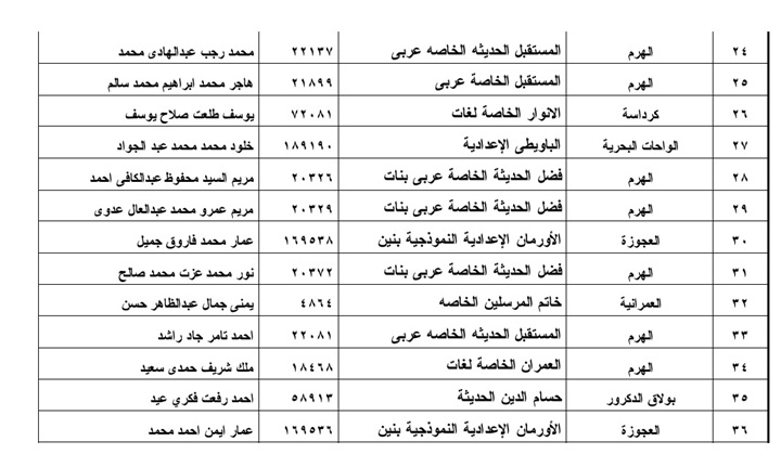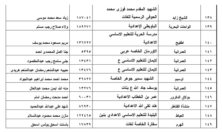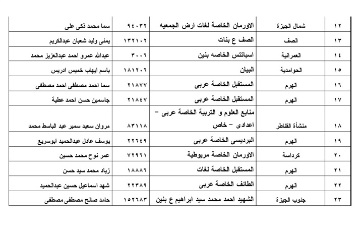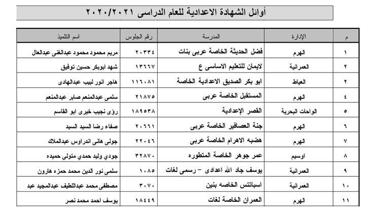 والبالغ عددهم (292 طالب وطالبة) وبلغ أجمالى الاوائل من المدارس العربي 80 طالب وطالبة والمدارس الخاص لغات 31 طالب طالبة والمدارس الرسمي 154 والمدارس الرسمى لغات 27 طالب وطالبة كما يهنى الإدارات الفائزة فى مقدمتهم إدارة الوراق وجنوب وزايد وأكتوبر والعمرانية .