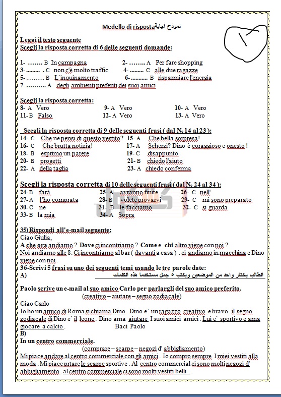 الإيطالية لطلاب الثانوية العامة وإليكم نموذج إجابة الاختبار الثاني