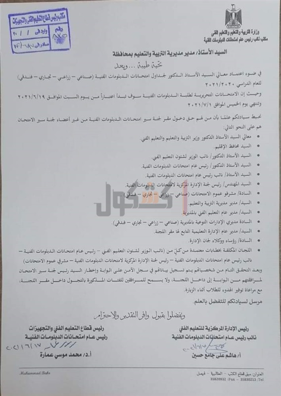 جاء ذلك خلال خطاب رسمي عممته وزارة التربية والتعليم والتعليم الفني اليوم على المديريات التعليمية، بشأن الاستعداد لعقد امتحانات الدبلومات الفنية (صناعي، زراعي، تجاري، فندقين والتي تنطلق السبت المقبل.