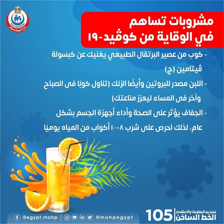 كشفت وزارة الصحة عن مشروبات تساهم في الوقاية من فيروس كورونا" كوفيد -19".