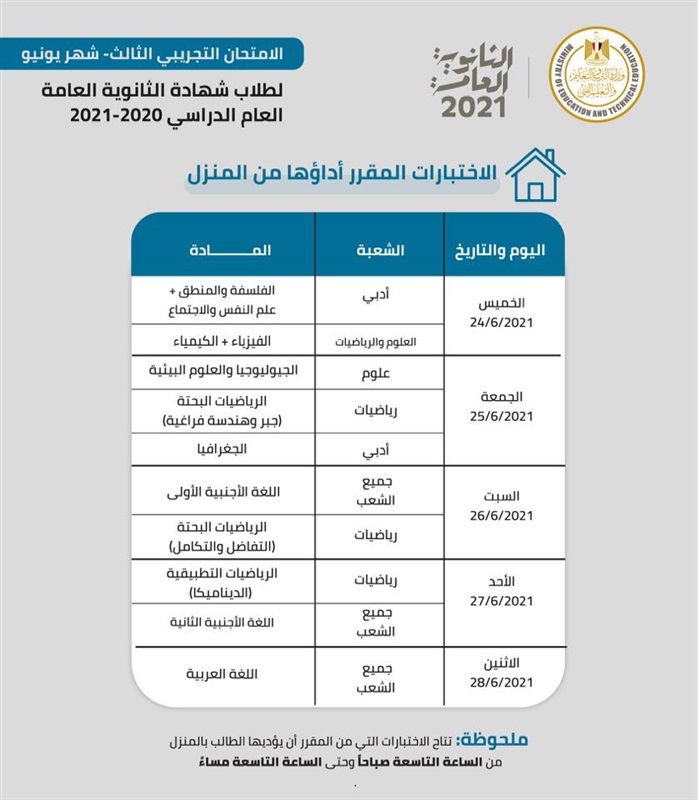 يبدأ غدًا.. ننشر جدول الامتحان التجريبي لطلاب الثانوية العامة 2021