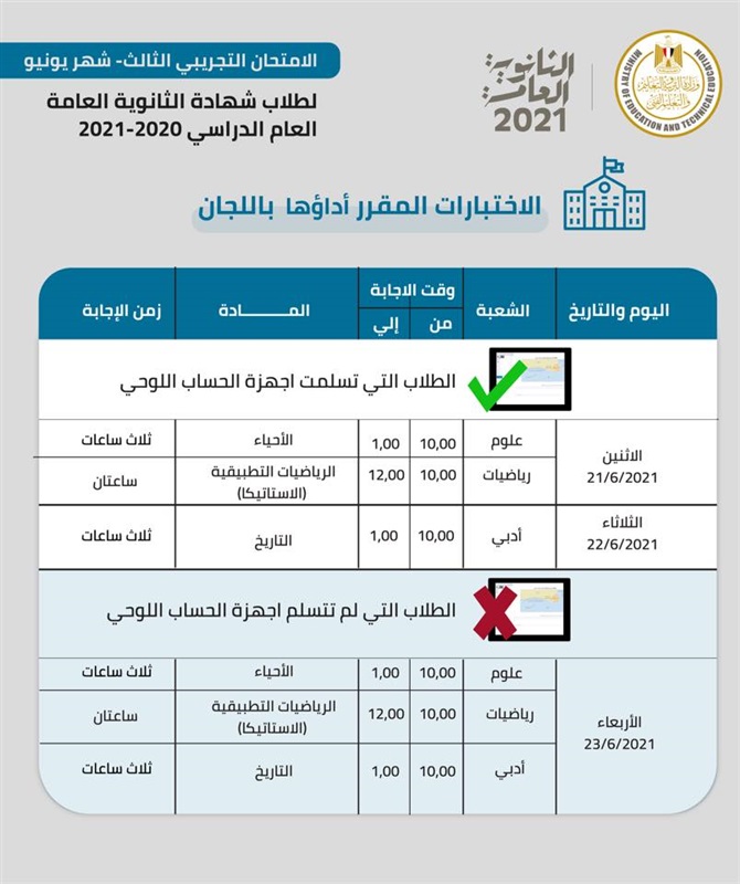 يبدأ غدا الامتحان التجريبي الثالث لطلاب الثانوية العامة النظامين والمنازل والمؤجلين والمقسمين، بمادة الأحياء لطلاب شعبة “علمي علوم”، والرياضيات التطبيقية لطلاب شعبة “علمي رياضة”، ومادة التاريخ لطلاب الشعبة الأدبية، لطلاب الذين تسلموا أجهزة التابلت.