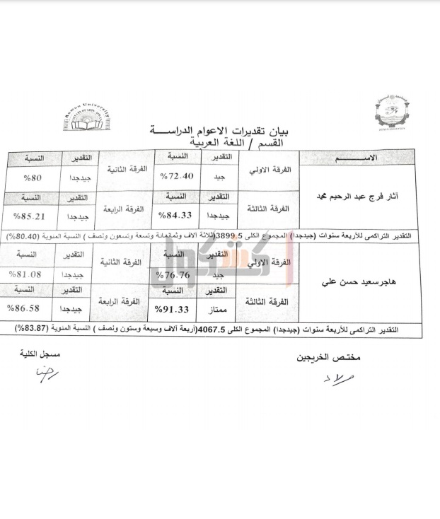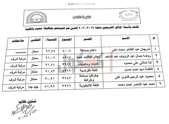 أصدرت جامعة أسوان، بيانا إعلاميا بشأن ما تناولته صفحات موقع التواصل الاجتماعي "فيسبوك" بنشر فيديو للخريجة آثار فرج عبدالرحيم محمد، والتي تدعي أن كلية الآداب جامعة أسوان تجاهلت تكليفها معيدة بقسم اللغة العربية للعام الجامعي 2020/2019، فلقد ثبت من واقع كشوف النتيجة أنها ليست الأولى على الدفعة كما تدعي حيث أن الخريجة الأولى على القسم هي هاجر سعيد حسن علي بتقدير تراكمي جيد جدا بمجموع 4067.5 بنسبة مئوية 83.87%، اما الطالبة أثار فرج عبدالرحيم محمد فهي الثانية على دفعتها بتقدير تراكمي جيد جدا ومجموعها 3899.5 بنسبة مئوية 80.4%.
