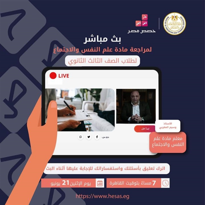 وأوضحت الوزارة بمنشور عبر صفحتها الرسمية على موقع التواصل الاجتماعي"فيسبوك" أن موعد بث مراجعة علم النفس اليوم الاثنين ٢١ يونيو الساعة ٧ مساءً، عبر منصه حصص مصر والصفحة الرسمية لوزارة التربية والتعليم على الفيسبوك.