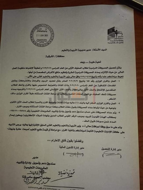 بناء على ما سبق ووفقا لموافقة وزير التربية والتعليم والتعليم الفنى السابق الإشارة إليها بعاليه يرجي التنبيه على كافة الإدارات التعليمية التابعة لكم بتنفيذ القرار ، مع مراعاة أن قيمة طابع التعليم أصبحت عشرة جنيهات.