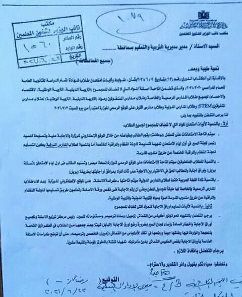 وأوضحت الوزارة أنه سيتم إتاحة الامتحانات على شكل (بوكليت) يقوم الطالب بطباعته من خلال الموقع الإلكتروني للوزارة والإجابة عليه وتسليمه للسيد رئيس لجنة السير في أول أيام الامتحان تمهيدًا لتسليمها للجنة النظام والمراقبة المختصة، أما بالنسبة لطلاب المدارس الدولية يكون التسليم للجنة النظام والمراقبة المختصة عن طريق مندوب المدرسة.