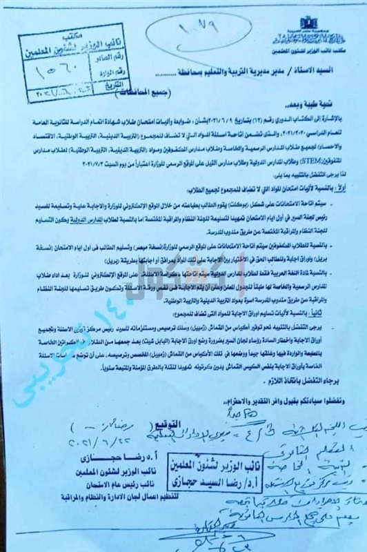 ارسلت وزارة التربية والتعليم والتعليم الفني ، خطابا لجميع مديريات التربية والتعليم بمختلف المحافظات، بشأن امتحانات الثانوية العامة .