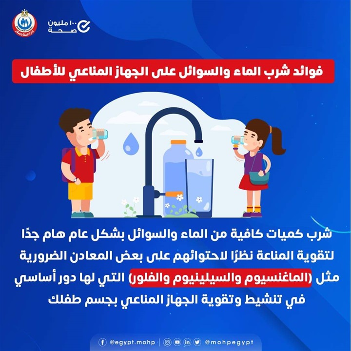 وكتبت"الصحة" منشور عبر الصفحة الرسمية للوزارة على موقع التواصل الاجتماعي"فيسبوك"،: شرب كميات كافية من الماء والسوائل بشكل عام هام جدا لتقوية المناعة نظرا لاحتوائهم على بعض المعادن الضرورية مثل" الماغنسيوم، السيلينيوم، الفلور"، التي لها دور أساسي في تنشيط وتقوية الجهاز المناعي بجسم طفلك.