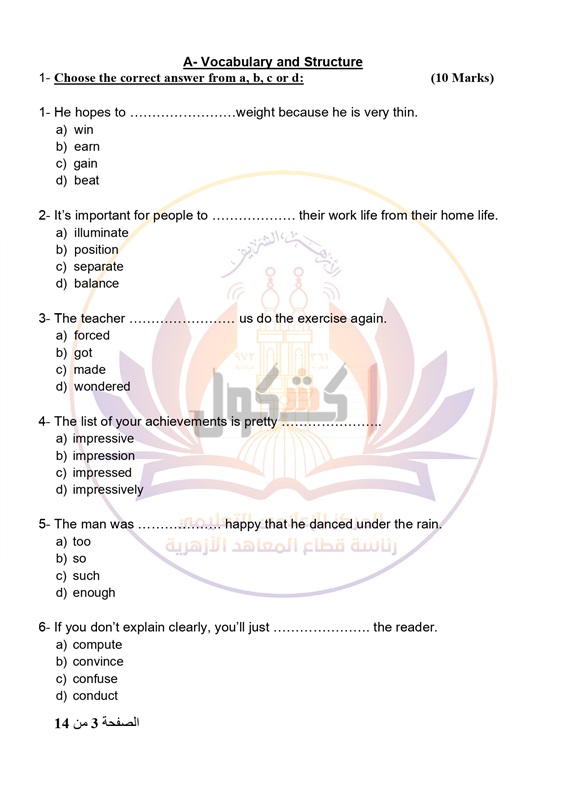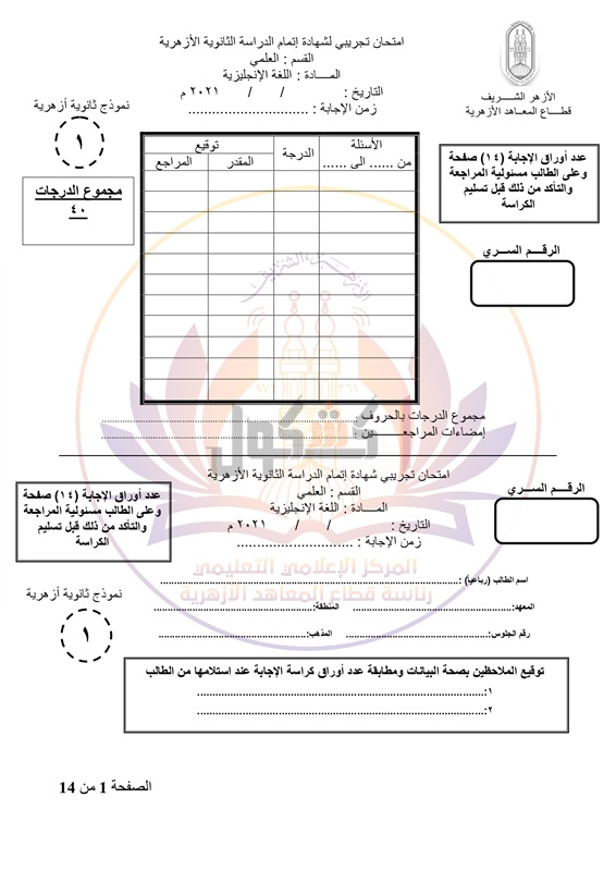 بوكليت الثانوية الأزهرية 2021 لمادة اللغة الإنجليزية التى يؤدى فيها طلاب القسم العلمى امتحاناتهم الغد الموافق 26 يونيه 2021 بجميع اللجان على مستوى الجمهورية.