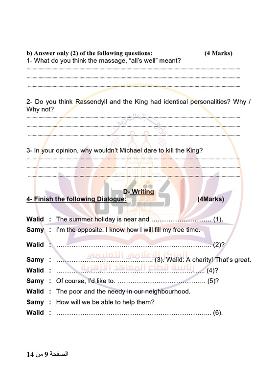 يضم السؤال الرابع من مادة اللغة الانجليزية جزء واحد وهو المحادثة وعليه 4 درجات فقط.