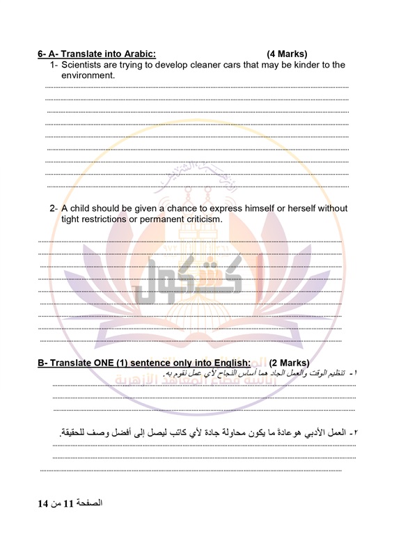 السؤال الأخير فى ورقة امتحانات اللغة الانجليزية، هو سؤال الترجمة الفورية وبه قطعتين الأولى عربية انجليزية والثانية انجليزية عربية، الترجمة من الانجليزية للعربية 4 درجات ومن العربية الى الانجليزية درجتين فقط.