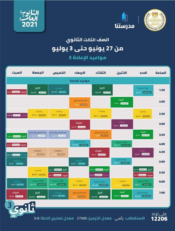 وأشارت الوزارة إلى أنه سيتم بث المراجعات عبر تردد: 12206 رأسي / معدل الترميز: 27500 / معامل تصحيح الخطأ: 6/ 5 .