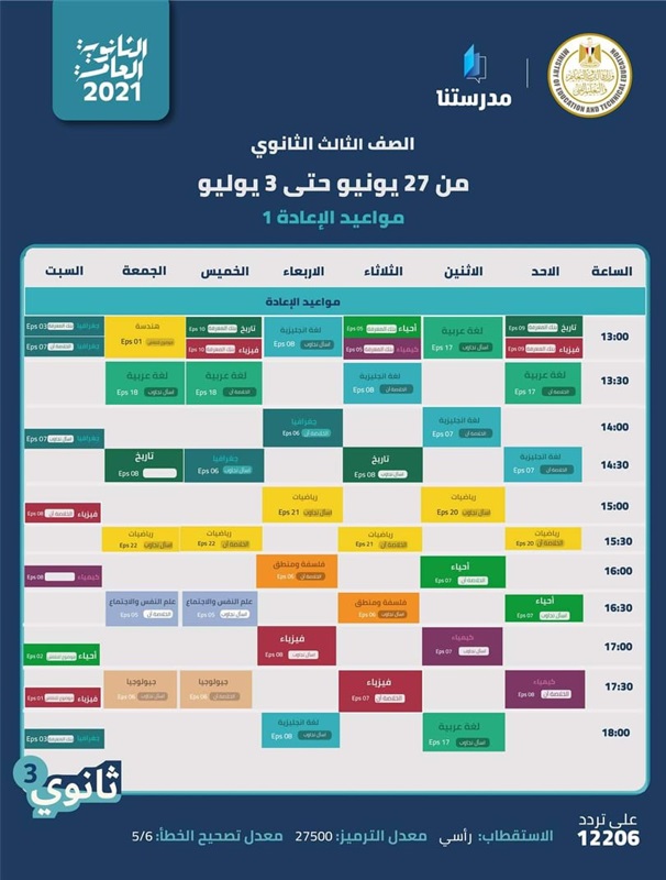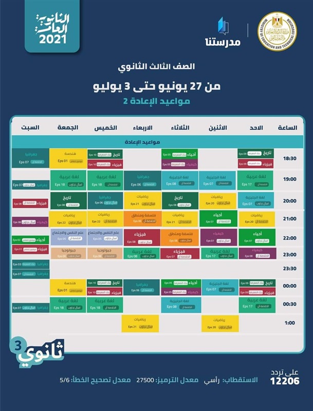 ونشرت الوزارة عبر صفحتها الرسمية على موقع التواصل الاجتماعي "فيسبوك" جداول الأسبوع السادس في الفترة من يوم الأحد ٢٧ يونيو حتى السبت ٣ يوليو ٢٠٢١.