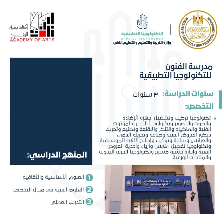 ونشرت الوزارة عبر صفحتها الشخصية بموقع التواصل الاجتماعي، أنه لمعرفة المزيد عن مدرسة الفنون للتكنولوجيا التطبيقية في تخصصات التالية: