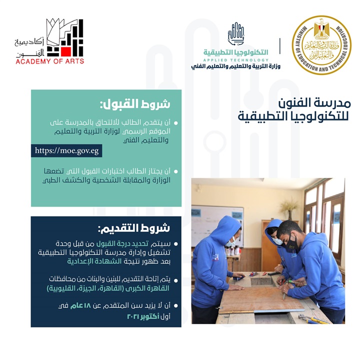 نشرت وزارة التربية والتعليم والتعليم الفني، انفوجرافًا بشأن كافة التفاصيل الخاصة مدرسة الفنون للتكنولوجيا التطبيقية، لجميع طلاب الشهادة الإعدادية.